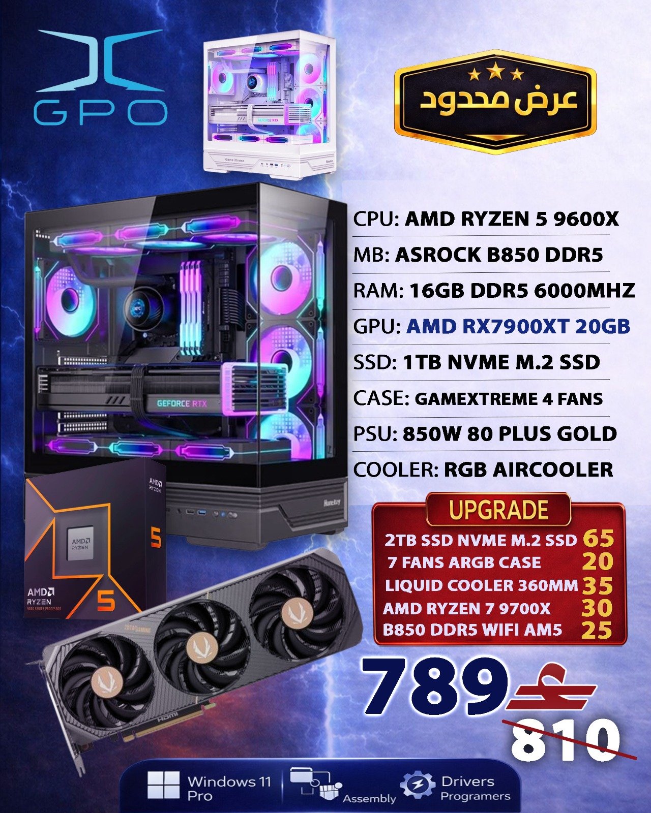 AMD RX7900XT 20GB AMD RYZEN 5 9600X ASROCK B850 DDR5 16GB DDR5 6000MHZ 1TB NVME M.2 SSD GAMEXTREME 4 FANS 850W 80 PLUS GOLD RGB AIRCOOLER